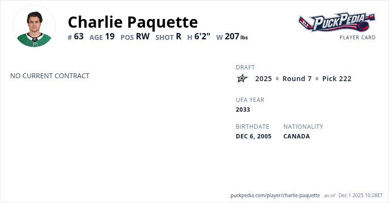 | 2025-26 | 20 | OHL | Guelph Storm | 24 | 9 | 12 | 21 | 6 | ||||||||||||||||||||||