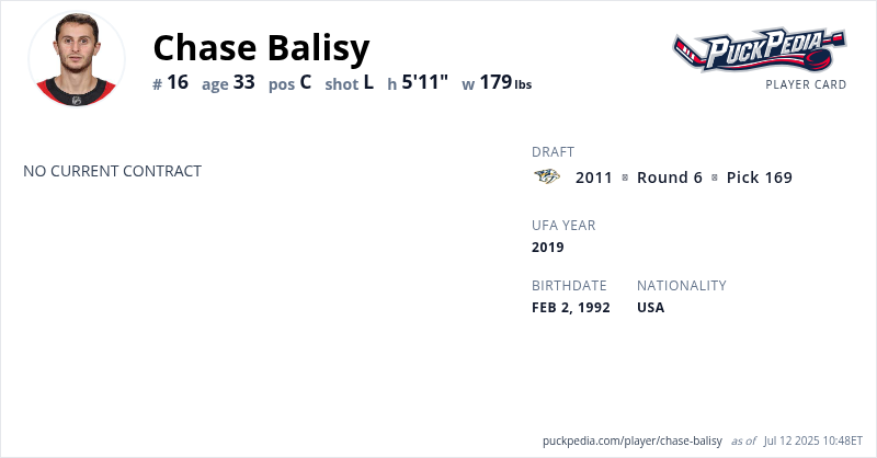 Chase Balisy is an Unrestricted Free Agent. His last contract was 1 year, $650,000 with a cap hit of $650,000 per season. It expired at the end of the 2018-19 season.