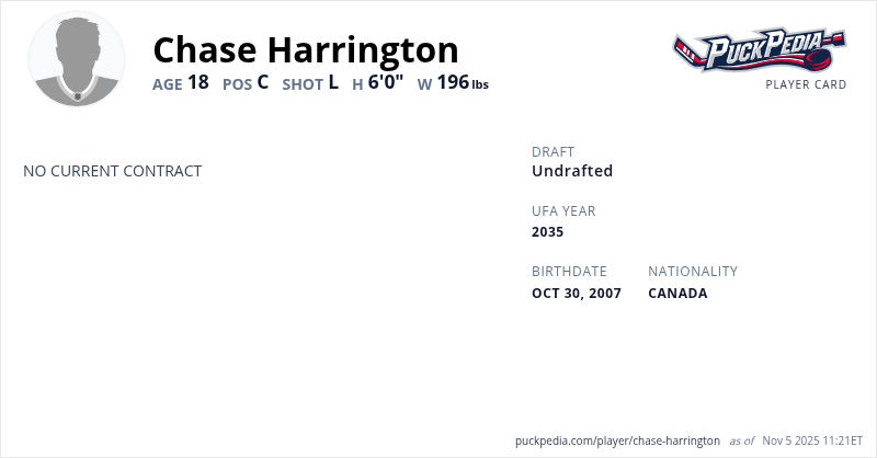 | 2024-25 | 17 | WHL | Spokane Chiefs | 68 | 19 | 31 | 50 | 41 | Playoffs | 20 | 6 | 8 | 14 | 0 | ||||||||||||||||