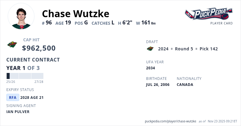 Chase Wutzke is signed to a 3 year, $2,887,500 contract with a cap hit of $962,500 per season, playing for the Minnesota Wild. His contract expires at the end of the 2027-28 season, making Wutzke a Restricted Free Agent.