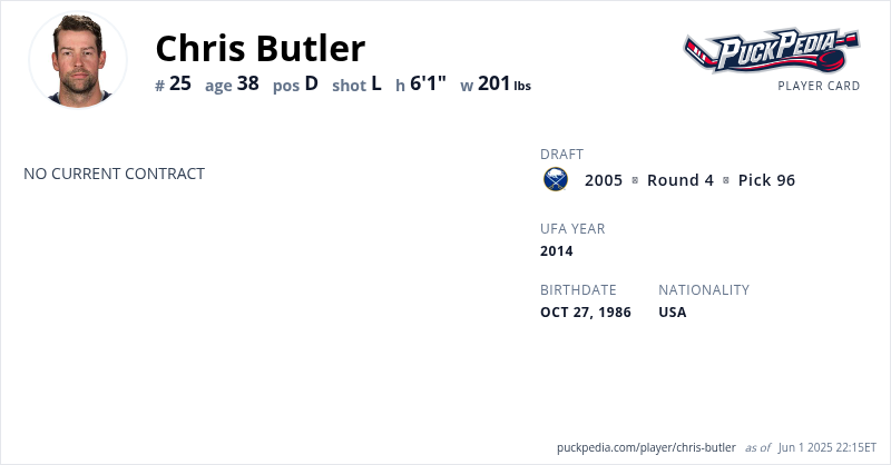 Chris Butler is an Unrestricted Free Agent. His last contract was 2 years, $1,300,000 with a cap hit of $650,000 per season. It expired at the end of the 2018-19 season.