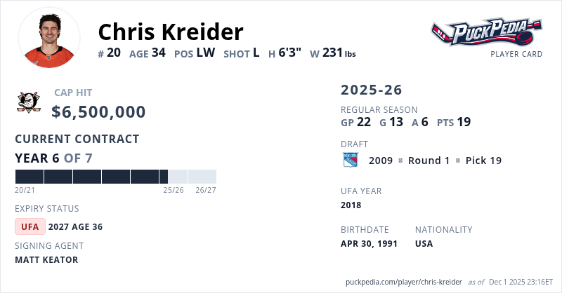 Chris Kreider is signed to a 7 year, $45,500,000 contract with a cap hit of $6,500,000 per season, playing for the Anaheim Ducks. His contract expires at the end of the 2026-27 season, making Kreider an Unrestricted Free Agent.