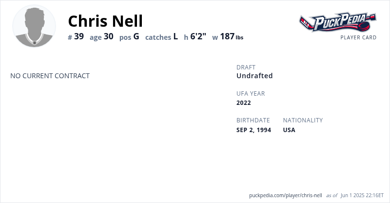 Chris Nell is an Unrestricted Free Agent (No Qualifying Offer). His last contract was 2 years, $1,850,000 with a cap hit of $925,000 per season. It expired at the end of the 2018-19 season.