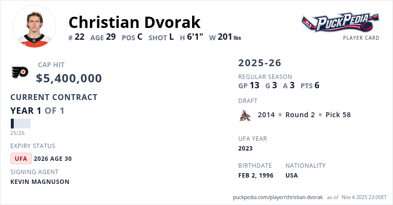 Christian Dvorak is signed to a 1 year, $5,400,000 contract with a cap hit of $5,400,000 per season, playing for the Philadelphia Flyers. His contract expires at the end of the 2025-26 season, making Dvorak an Unrestricted Free Agent.