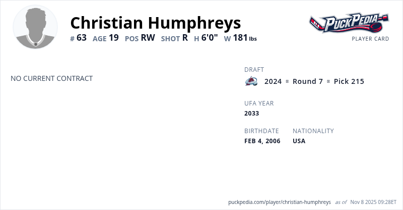 | 2024-25 | 18 | OHL | Kitchener Rangers | 28 | 11 | 22 | 33 | 8 | Playoffs | 13 | 3 | 7 | 10 | 0 | ||||||||||||||||
