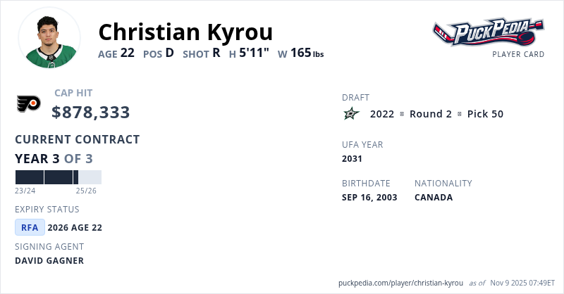 Christian Kyrou is signed to a 3 year, $2,634,999 contract with a cap hit of $878,333 per season, playing for the Philadelphia Flyers. His contract expires at the end of the 2025-26 season, making Kyrou a Restricted Free Agent.