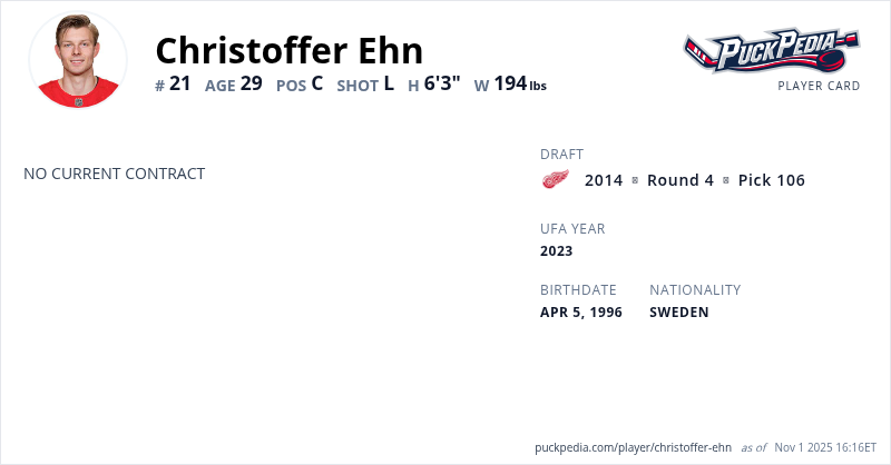 Christoffer Ehn is an Unrestricted Free Agent (No Qualifying Offer). His last contract was 3 years, $2,277,501 with a cap hit of $759,167 per season. It expired at the end of the 2019-20 season.