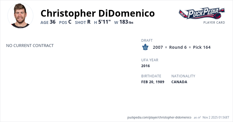 Christopher DiDomenico is an Unrestricted Free Agent. His last contract was 2 years, $1,225,000 with a cap hit of $612,500 per season. It expired at the end of the 2017-18 season.