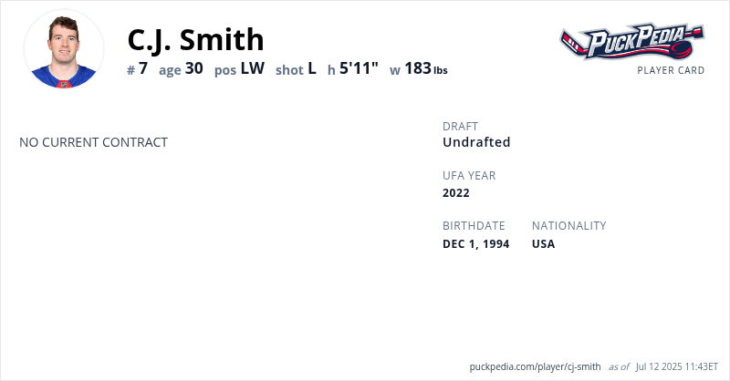C.J. Smith is an Unrestricted Free Agent. His last contract was 1 year, $750,000 with a cap hit of $750,000 per season. It expired at the end of the 2022-23 season.