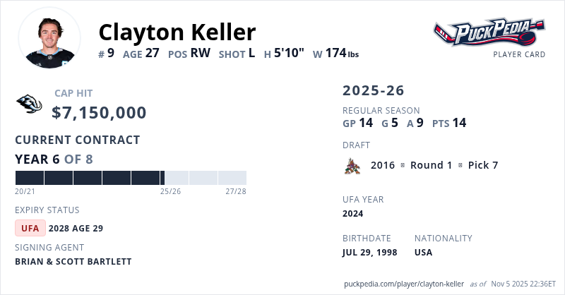 Clayton Keller is signed to a 8 year, $57,200,000 contract with a cap hit of $7,150,000 per season, playing for the Utah Mammoth. His contract expires at the end of the 2027-28 season, making Keller an Unrestricted Free Agent.