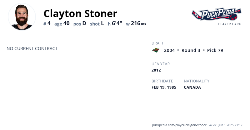 Clayton Stoner is an Unrestricted Free Agent. His last contract was 4 years, $13,000,000 with a cap hit of $3,250,000 per season. It expired at the end of the 2017-18 season.