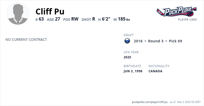 Cliff Pu is an Unrestricted Free Agent (No Qualifying Offer). His last contract was 3 years, $2,235,000 with a cap hit of $745,000 per season. It expired at the end of the 2020-21 season.