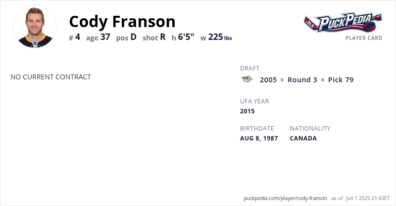 Cody Franson is an Unrestricted Free Agent. His last contract was 1 year, $1,000,000 with a cap hit of $1,000,000 per season. It expired at the end of the 2017-18 season.
