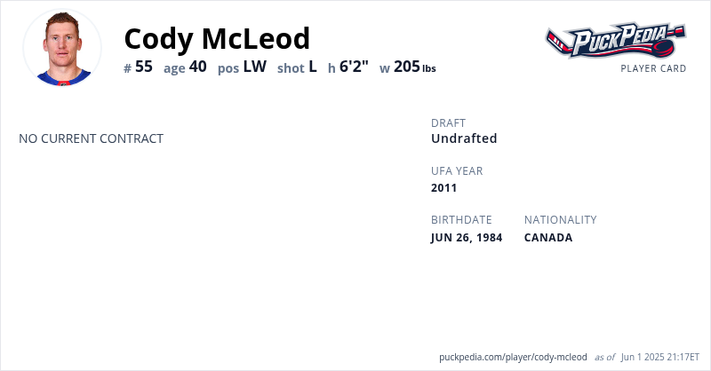 Cody McLeod is an Unrestricted Free Agent. His last contract was 1 year, $750,000 with a cap hit of $750,000 per season. It expired at the end of the 2018-19 season.