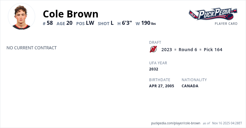 | 2024-25 | 19 | OHL | Brantford Bulldogs | 67 | 33 | 37 | 70 | 55 | Playoffs | 11 | 2 | 7 | 9 | 0 | ||||||||||||||||
