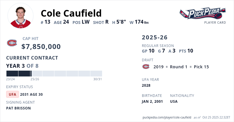 Cole Caufield is signed to a 8 year, $62,800,000 contract with a cap hit of $7,850,000 per season, playing for the Montreal Canadiens. His contract expires at the end of the 2030-31 season, making Caufield an Unrestricted Free Agent.