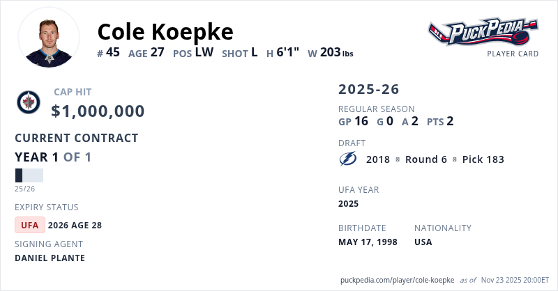 Cole Koepke is signed to a 1 year, $1,000,000 contract with a cap hit of $1,000,000 per season, playing for the Winnipeg Jets. His contract expires at the end of the 2025-26 season, making Koepke an Unrestricted Free Agent.