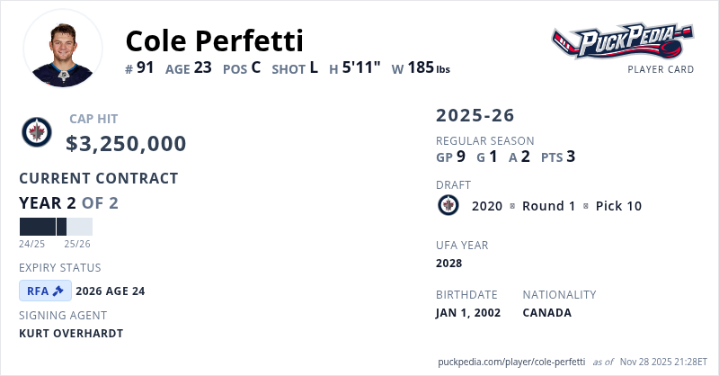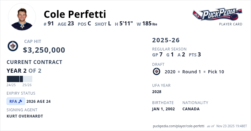 Cole Perfetti is signed to a 2 year, $6,500,000 contract with a cap hit of $3,250,000 per season, playing for the Winnipeg Jets. His contract expires at the end of the 2025-26 season, making Perfetti a Restricted Free Agent.
