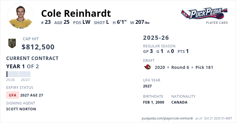 Cole Reinhardt is signed to a 2 year, $1,625,000 contract with a cap hit of $812,500 per season, playing for the Vegas Golden Knights. His contract expires at the end of the 2026-27 season, making Reinhardt an Unrestricted Free Agent.