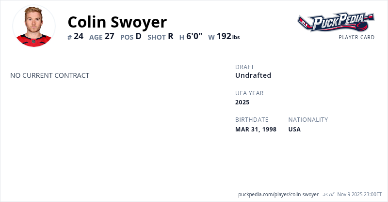 Colin Swoyer is an Unrestricted Free Agent (No Qualifying Offer). His last contract was 1 year, $842,500 with a cap hit of $842,500 per season. It expired at the end of the 2022-23 season.