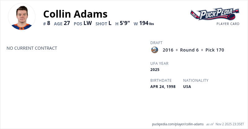 Collin Adams is an Unrestricted Free Agent (No Qualifying Offer). His last contract was 2 years, $1,600,000 with a cap hit of $800,000 per season. It expired at the end of the 2022-23 season.