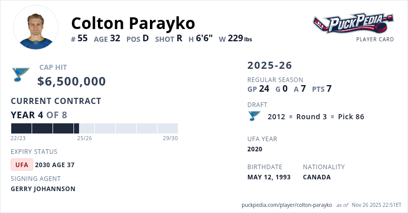 Colton Parayko is signed to a 8 year, $52,000,000 contract with a cap hit of $6,500,000 per season, playing for the St. Louis Blues. His contract expires at the end of the 2029-30 season, making Parayko an Unrestricted Free Agent.