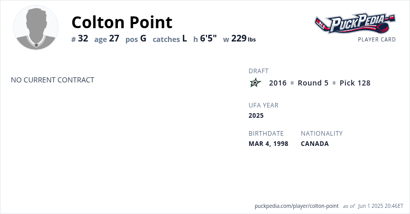 Colton Point is an Unrestricted Free Agent (No Qualifying Offer). His last contract was 1 year, $750,000 with a cap hit of $750,000 per season. It expired at the end of the 2021-22 season.