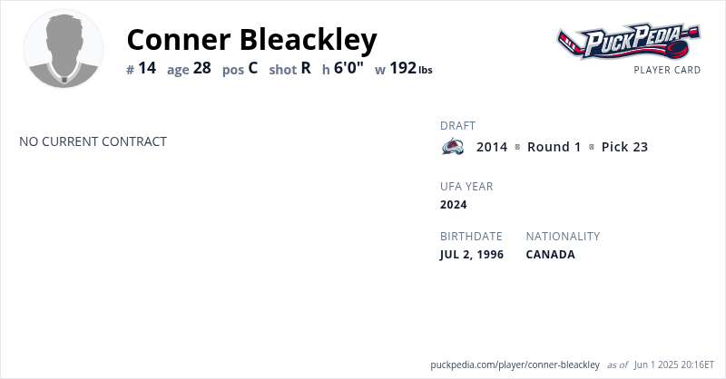 Conner Bleackley is an Unrestricted Free Agent (No Qualifying Offer). His last contract was 3 years, $2,100,000 with a cap hit of $700,000 per season. It expired at the end of the 2018-19 season.