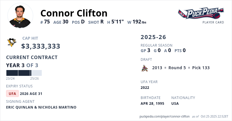 Connor Clifton is signed to a 3 year, $10,000,000 contract with a cap hit of $3,333,333 per season, playing for the Pittsburgh Penguins. His contract expires at the end of the 2025-26 season, making Clifton an Unrestricted Free Agent.