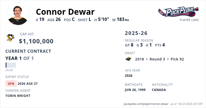 Connor Dewar is signed to a 1 year, $1,100,000 contract with a cap hit of $1,100,000 per season, playing for the Pittsburgh Penguins. His contract expires at the end of the 2025-26 season, making Dewar an Unrestricted Free Agent.