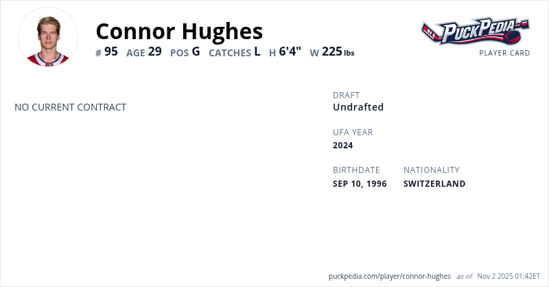 Connor Hughes is an Unrestricted Free Agent. His last contract was 1 year, $775,000 with a cap hit of $775,000 per season. It expired at the end of the 2024-25 season.