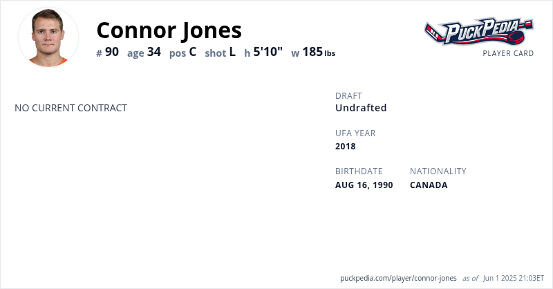 Connor Jones is an Unrestricted Free Agent. His last contract was 1 year, $650,000 with a cap hit of $650,000 per season. It expired at the end of the 2017-18 season.