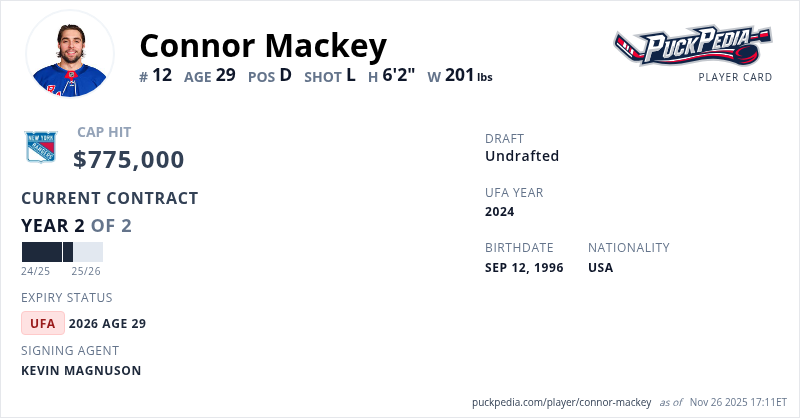 Connor Mackey is signed to a 2 year, $1,550,000 contract with a cap hit of $775,000 per season, playing for the New York Rangers. His contract expires at the end of the 2025-26 season, making Mackey an Unrestricted Free Agent.