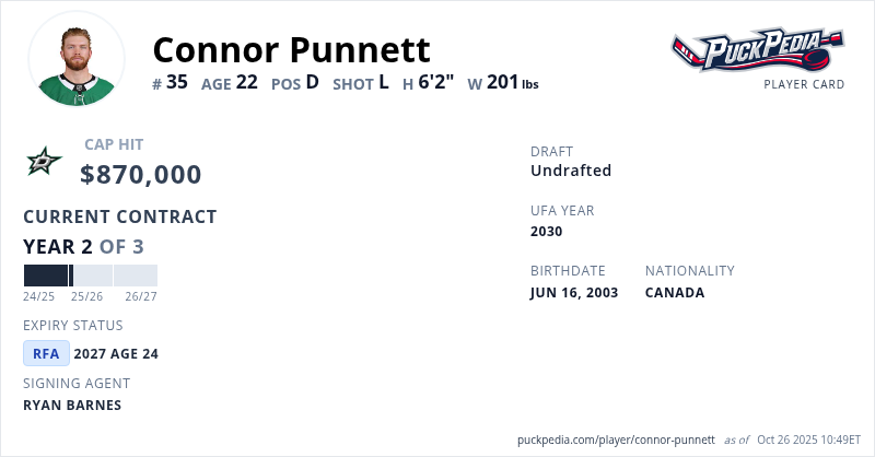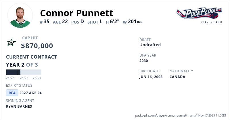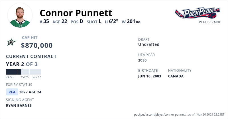 Connor Punnett is signed to a 3 year, $2,610,000 contract with a cap hit of $870,000 per season, playing for the Dallas Stars. His contract expires at the end of the 2026-27 season, making Punnett a Restricted Free Agent.