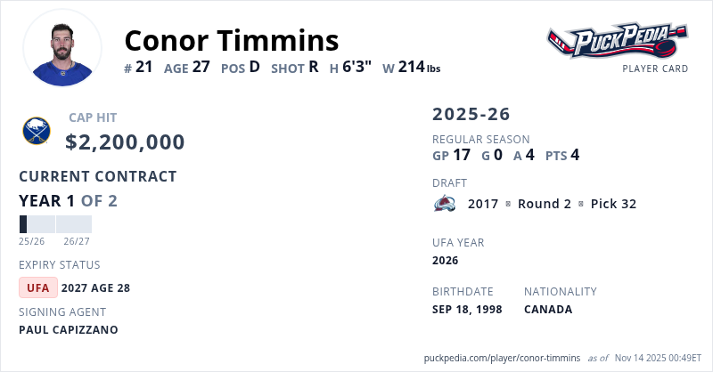 Conor Timmins is signed to a 2 year, $4,400,000 contract with a cap hit of $2,200,000 per season, playing for the Buffalo Sabres. His contract expires at the end of the 2026-27 season, making Timmins an Unrestricted Free Agent.