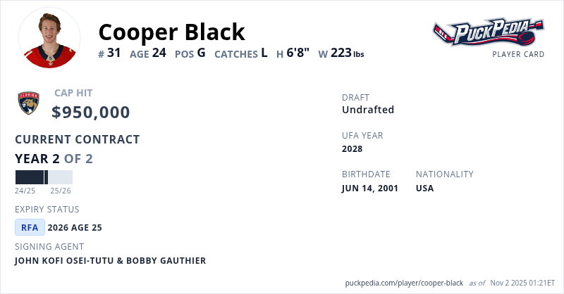 Cooper Black is signed to a 2 year, $1,900,000 contract with a cap hit of $950,000 per season, playing for the Florida Panthers. His contract expires at the end of the 2025-26 season, making Black a Restricted Free Agent.