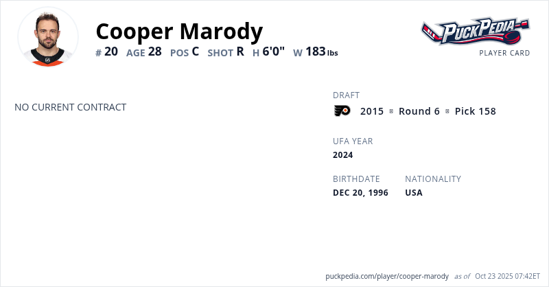 Cooper Marody is an Unrestricted Free Agent. His last contract was 2 years, $1,525,000 with a cap hit of $762,500 per season. It expired at the end of the 2023-24 season.