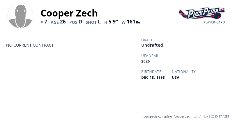 Cooper Zech is an Unrestricted Free Agent (No Qualifying Offer). His last contract was 2 years, $1,675,000 with a cap hit of $837,500 per season. It expired at the end of the 2022-23 season.