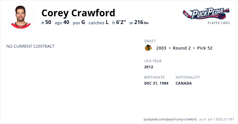 Corey Crawford is an Unrestricted Free Agent. His last contract was 2 years, $7,800,000 with a cap hit of $3,900,000 per season. It expired at the end of the 2021-22 season.
