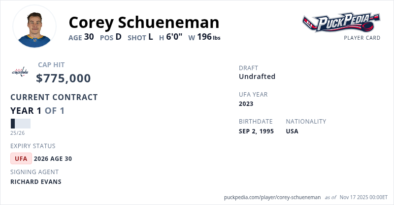 Corey Schueneman is signed to a 1 year, $775,000 contract with a cap hit of $775,000 per season, playing for the Washington Capitals. His contract expires at the end of the 2025-26 season, making Schueneman an Unrestricted Free Agent.