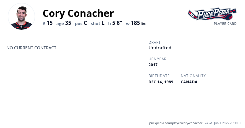 Cory Conacher is an Unrestricted Free Agent. His last contract was 1 year, $700,000 with a cap hit of $700,000 per season. It expired at the end of the 2019-20 season.