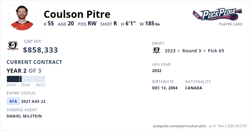 Coulson Pitre is signed to a 3 year, $2,575,002 contract with a cap hit of $858,334 per season, playing for the Anaheim Ducks. His contract expires at the end of the 2026-27 season, making Pitre a Restricted Free Agent.