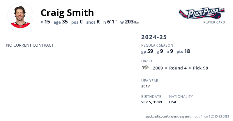 Craig Smith is an Unrestricted Free Agent. His last contract was 1 year, $1,000,000 with a cap hit of $1,000,000 per season. It expired at the end of the 2024-25 season.
