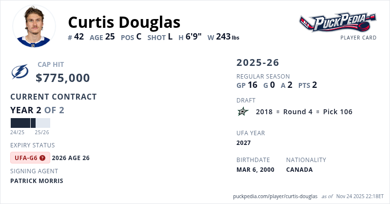 Curtis Douglas is signed to a 2 year, $1,550,000 contract with a cap hit of $775,000 per season, playing for the Tampa Bay Lightning. His contract expires at the end of the 2025-26 season, making Douglas an Unrestricted Free Agent (Group 6).