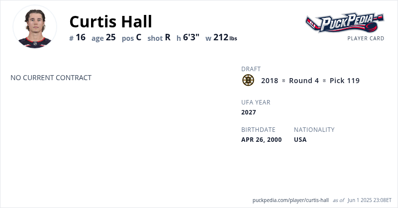 Curtis Hall is an Unrestricted Free Agent (No Qualifying Offer). His last contract was 3 years, $2,775,000 with a cap hit of $925,000 per season. It expired at the end of the 2023-24 season.