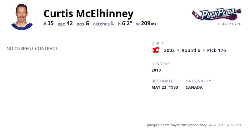 Curtis McElhinney is an Unrestricted Free Agent. His last contract was 2 years, $2,600,000 with a cap hit of $1,300,000 per season. It expired at the end of the 2020-21 season.