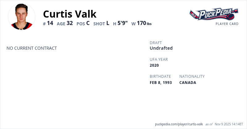 Curtis Valk is a Restricted Free Agent. His last contract was 1 year, $682,500 with a cap hit of $682,500 per season. It expired at the end of the 2017-18 season.