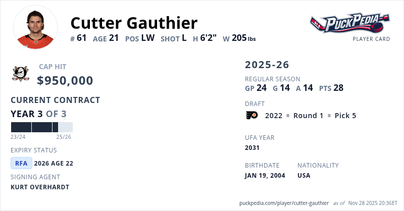 Cutter Gauthier is signed to a 3 year, $2,850,000 contract with a cap hit of $950,000 per season, playing for the Anaheim Ducks. His contract expires at the end of the 2025-26 season, making Gauthier a Restricted Free Agent.