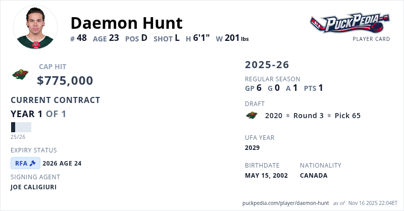 Daemon Hunt is signed to a 1 year, $775,000 contract with a cap hit of $775,000 per season, playing for the Minnesota Wild. His contract expires at the end of the 2025-26 season, making Hunt a Restricted Free Agent.