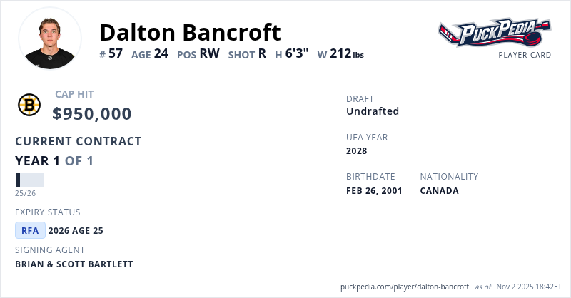 Dalton Bancroft is signed to a 1 year, $950,000 contract with a cap hit of $950,000 per season, playing for the Boston Bruins. His contract expires at the end of the 2025-26 season, making Bancroft a Restricted Free Agent.